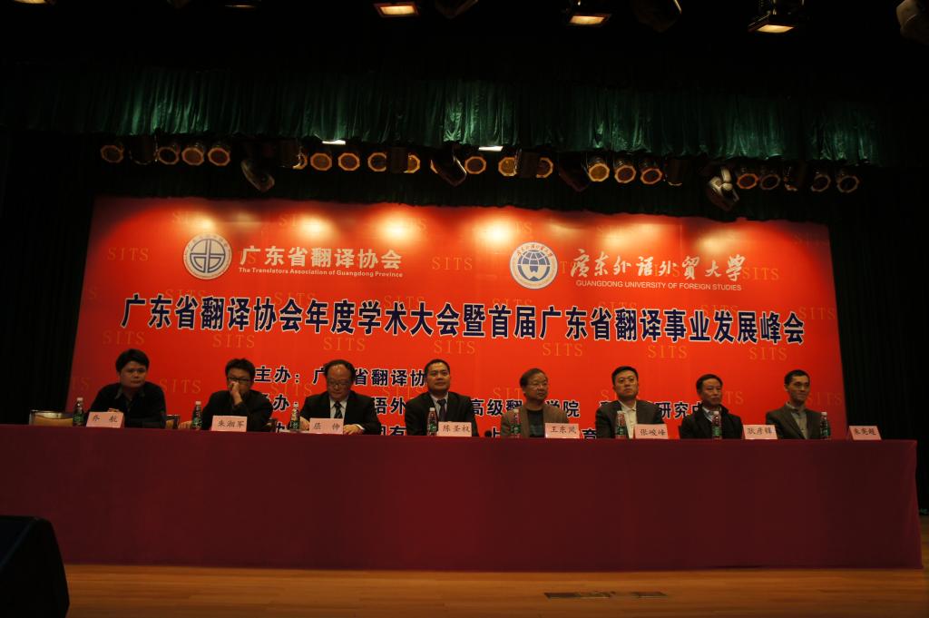 2014年3月22日,广东省翻译协会2013年度学术大会暨首届广东省翻译事业发展峰会在广东外语外贸大学(北校区)第六教学楼学术报告厅隆重举行。会议由广东省翻译协会主办,广东外语外贸大学高级翻译学院、翻译学研究中心承办,蓝鸽集团有限公司、上海外语教育出版社协办。本次大会规模宏大,气氛热烈,盛况空前,省内各高校专家、学者、广东省高级人民法院、政府外事办、东风日产、南方航空、华为集团、蓝鸽集团、各翻译公司及翻译培训机构等200多名译界代表亲临大会。广东省科学技术协会何真书记、广东外语外贸大学仲伟合校长、广东财经大学雍和明副校长等领导出席了开幕式。大会由广东省翻译协会秘书长陈定刚主持。