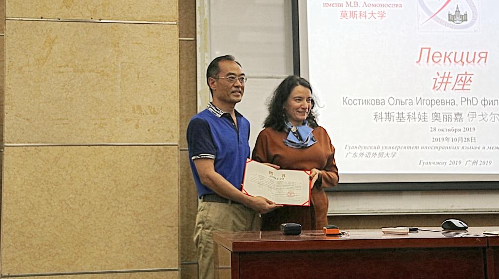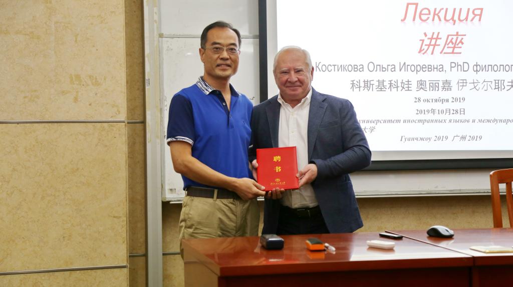 2019年10月28日,莫斯科国立大学高翻学院院长加尔博夫斯基教授(Garbovskiy N.K.)与副院长斯季科娃教授(Kostikova O.I.)一行来访翻译学研究中心为广大师生作海外名师系列讲座,两位教授同时受聘我中心兼职研究员。