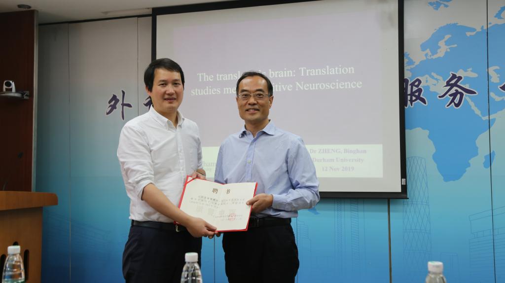 2019年11月12日,英国杜伦大学现代语言与文化学院副教授、翻译学与语言学博士生导师郑冰寒博士受邀来访翻译学研究中心交流并受聘我中心兼职研究员。郑冰寒博士此行为我校翻译学硕博士研究生和青年教师带来了 “译者的大脑:当翻译学遇到认知神经科学”和“人工智能冲击下的翻译与翻译研究”两场学术前沿讲座,介绍了他的科研团队在该领域的最新研究方法和进展。与此同时,郑冰寒博士还就我校与杜伦大学的翻译学硕士生联合培养项目进行了全面介绍,邀请更多翻译专业研究生和青年学者到杜伦学习,共同促进两校的业务合作与师生交流。中心主任赵军峰教授主持了讲座并为郑冰寒博士颁发了兼职研究员聘书,高级翻译学院邢杰副院长一同接待了郑冰寒博士并参加了讲座。
