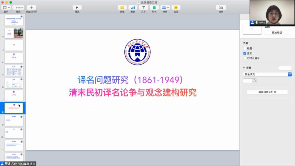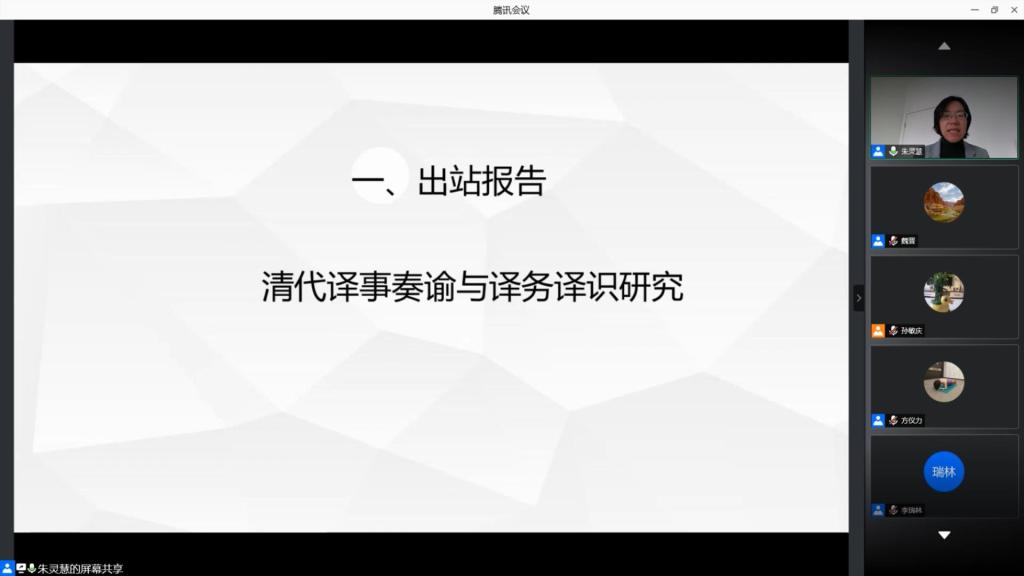 朱灵慧博士首先对在站期间的科研与工作情况进行了总结汇报,主题为《清代译事奏谕与译务译识研究》。其主要研究工作包括对大量清代档案史料的搜集和甄别,以及在梳理细读中分析考辨,筛选出其中对清代翻译事务、翻译事件、翻译认识、翻译政策等相关的篇目。整体上,朱灵慧博士采用了大量个案分析,深入具体文本和语境,由微至宏,以点带面,透彻深入考察,洞悉特定翻译事件和翻译政策背后的社会历史语境。其报告陈述条理清晰,视野开阔,获得了考核专家的一致好评。