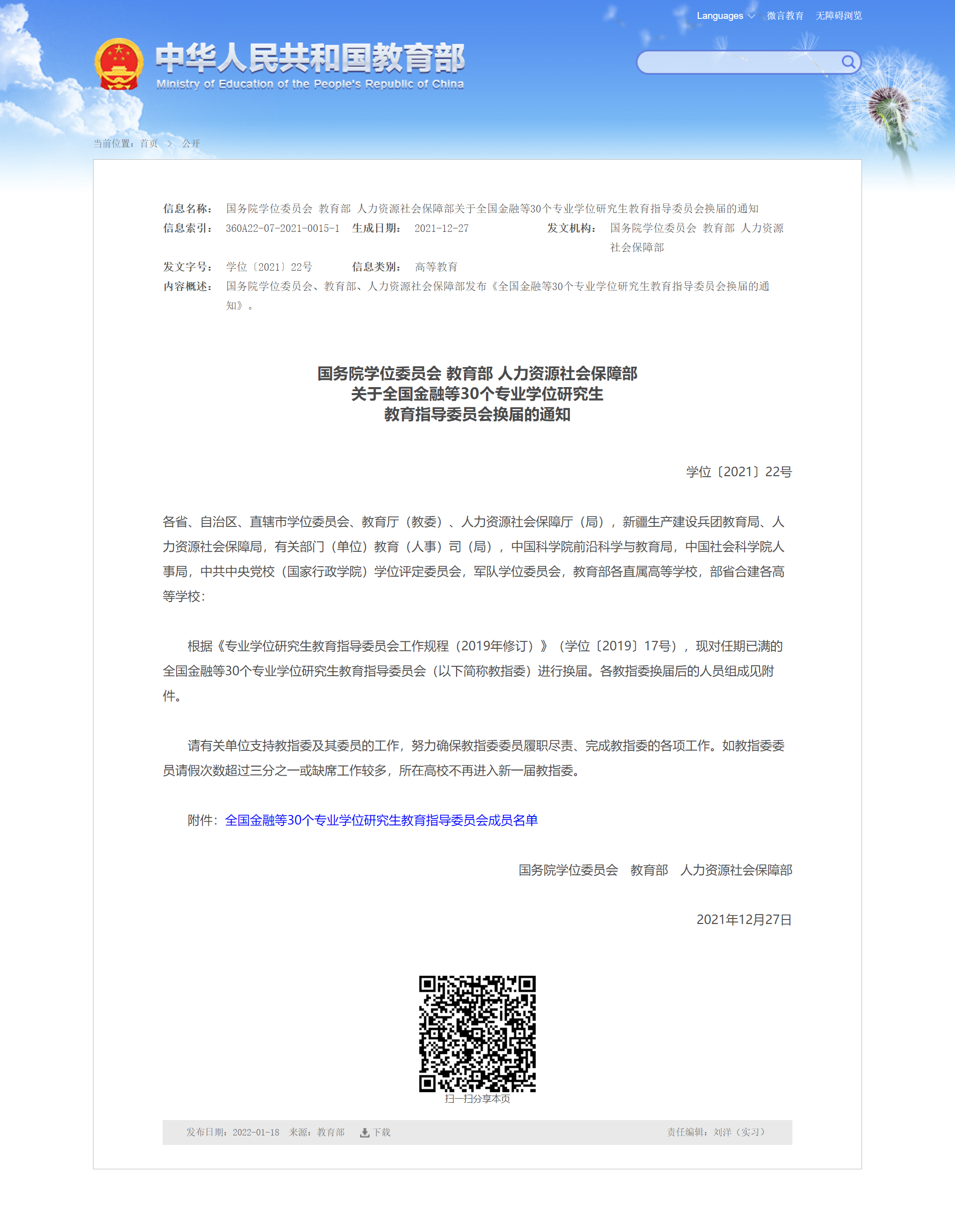 近日,国务院学位委员会、教育部、人力资源社会保障部公布了全国30个专业学位研究生教育指导委员会新一届委员名单,我中心主任赵军峰教授当选第四届全国翻译专业学位研究生教育指导委员会副主任委员。