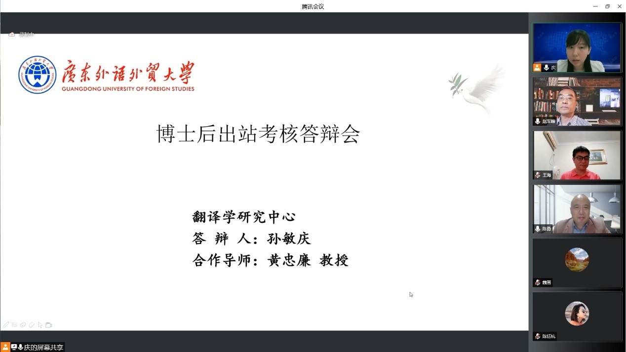 2022年4月7日晚,翻译学研究中心在腾讯会议举行了博士后出站线上答辩会,考核评估孙敏庆博士入站以来的研究工作。考核委员会由信息工程大学洛阳校区陈勇教授、上海外国语大学郑敏宇教授、广东外语外贸大学西语学院刘丽芬教授、新闻与传播学院王海教授和翻译学研究中心主任赵军峰教授组成,其中赵军峰教授担任委员会主席。孙敏庆博士后合作导师黄忠廉教授、广外人事处陈钰杭老师等人也参加了本次考核会。