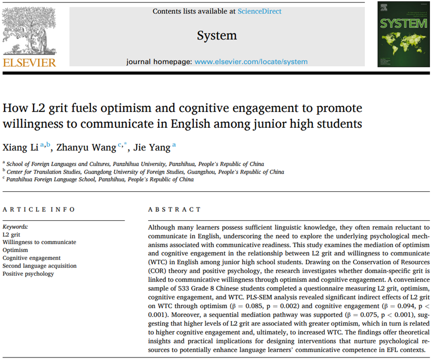 2. Li X, Wang Z*, Yang J. How L2 grit fuels optimism and cognitive engagement to promote willingness to communicate in English among junior high students [J]. System, 2025, 134: 103798. (SSCI Q1, 中科院一区Top,一类A)