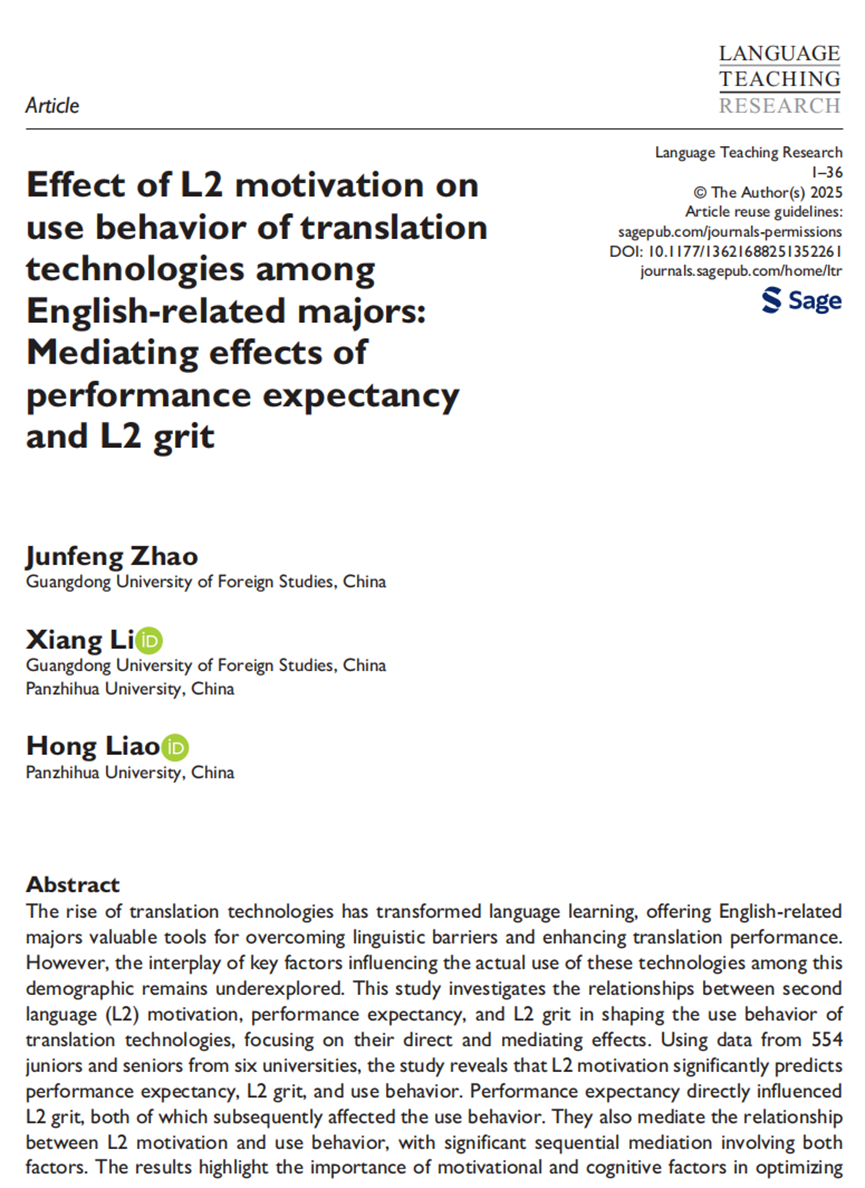 1. Zhao J, Li X*, Liao H. Effect of L2 motivation on use behavior of translation technologies among English-related majors: Mediating effects of performance expectancy and L2 grit [J]. Language Teaching Research, 2025, 10.1177/13621688251352261. (SSCI Q1, 中科院一区Top,一类A)