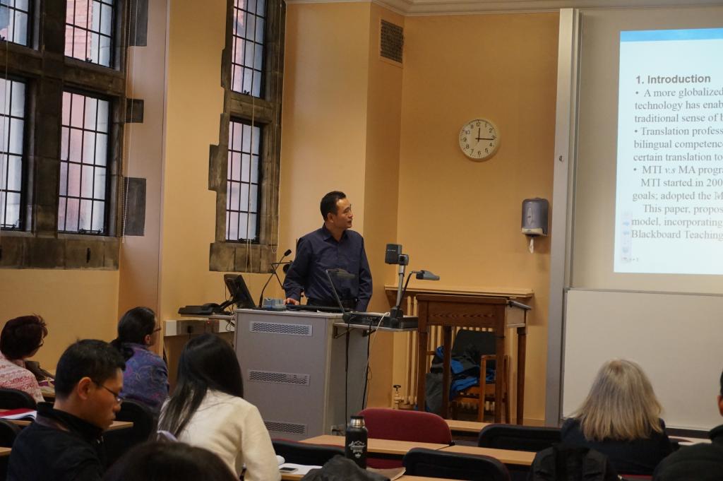 莫爱屏教授主持了部分主题发言,并在“口笔译教学”分组会议做了题为”ATechnology based Model in MTI Education”的演讲。李洋以The Alleviating Effects of PrefabricatedChunks on Consecutive Interpreting—An Exploration Based on the StudentTrainees’ Corpus为题目进行了发言。