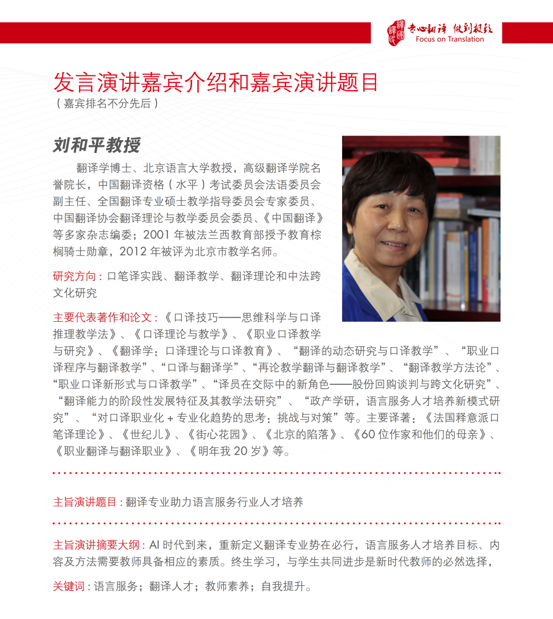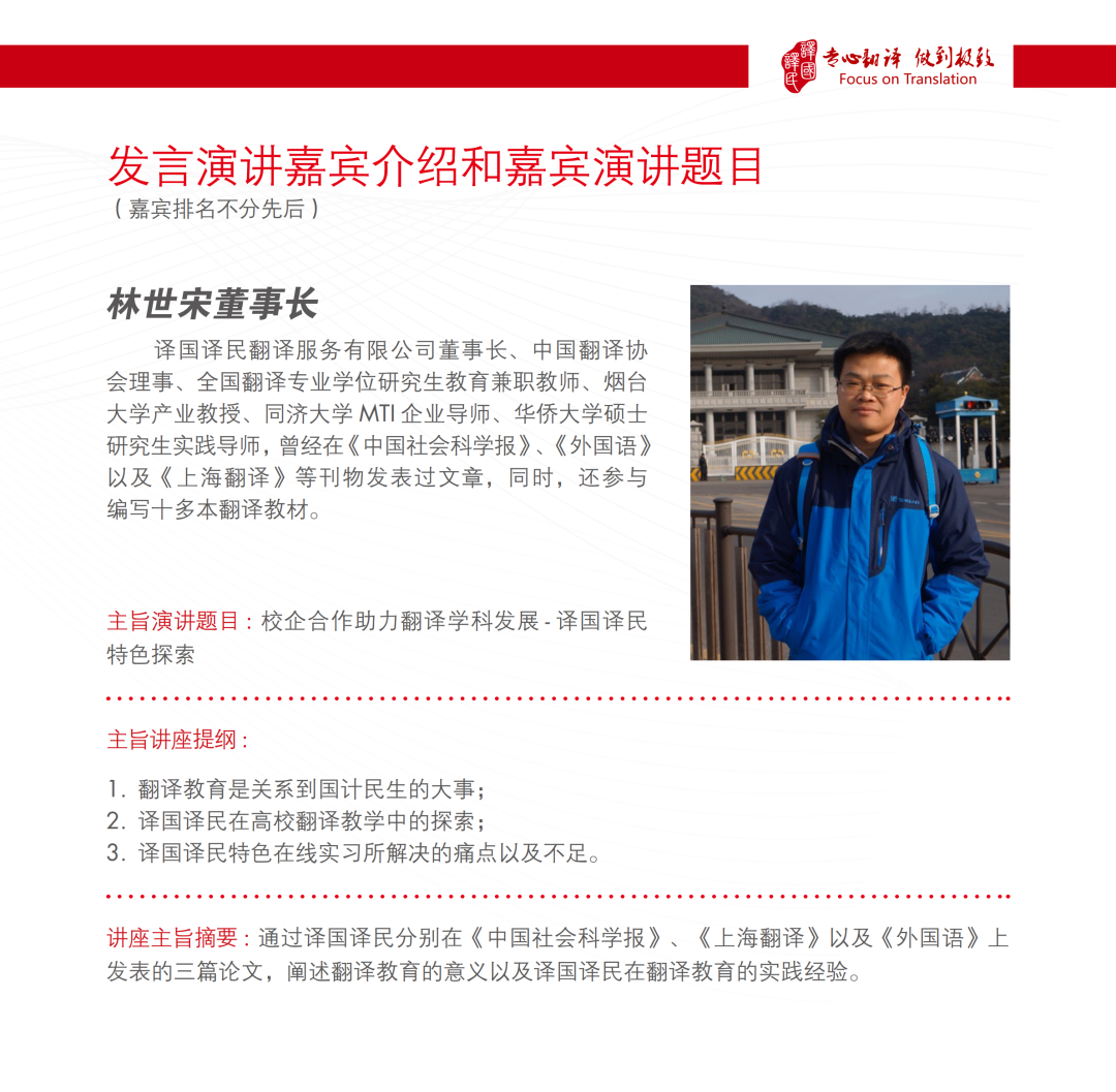 6月7日上午,由中国译协常务副会长、中国翻译研究院副院长黄友义教授做主旨为《新时代背景下的翻译人才培养》的精彩发言;北京语言大学教授,高级翻译学院名誉院长刘和平教授做主旨为《翻译专业助力语言服务行业人才培养》的精彩发言;武汉译国译民教育科技有限公司总经理俞剑辉、译国译民生产与资源中心总监李凌波做主旨为《译国译民特色校企合作助力翻译教育》的精彩发言。