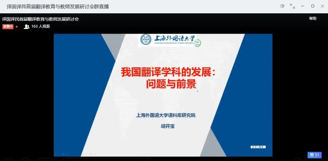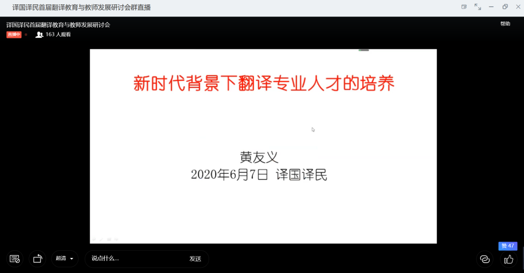 2020年6月6日至7日上午,译国译民首届翻译教育与教师发展研讨会在云端会议室成功举办。本次研讨会由译国译民翻译服务公司主办,特邀中国英汉语比较研究会外语学科发展研究专业委员会为指导单位,邀请重磅级专家团队,以“翻译教育与教师职业发展”为主题,利用钉钉大数据平台,网络在线形式开展本次研讨活动。来自全国各地的高等院校教师及领导等共计超400人嘉宾齐聚云端,共襄学术盛宴。