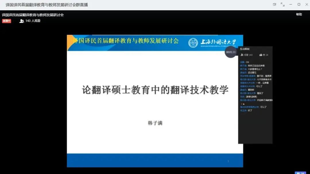 专家们分享的内容精彩纷呈,群内讨论氛围激烈和深入,参会者表示收获颇丰。聚焦翻译教育、学术内容充实的研讨会接近尾声,主办方代表武汉译国译民教育科技有限公司总经理俞剑辉致闭幕辞,译国译民首届翻译教育与教师发展研讨会最后圆满落幕。
