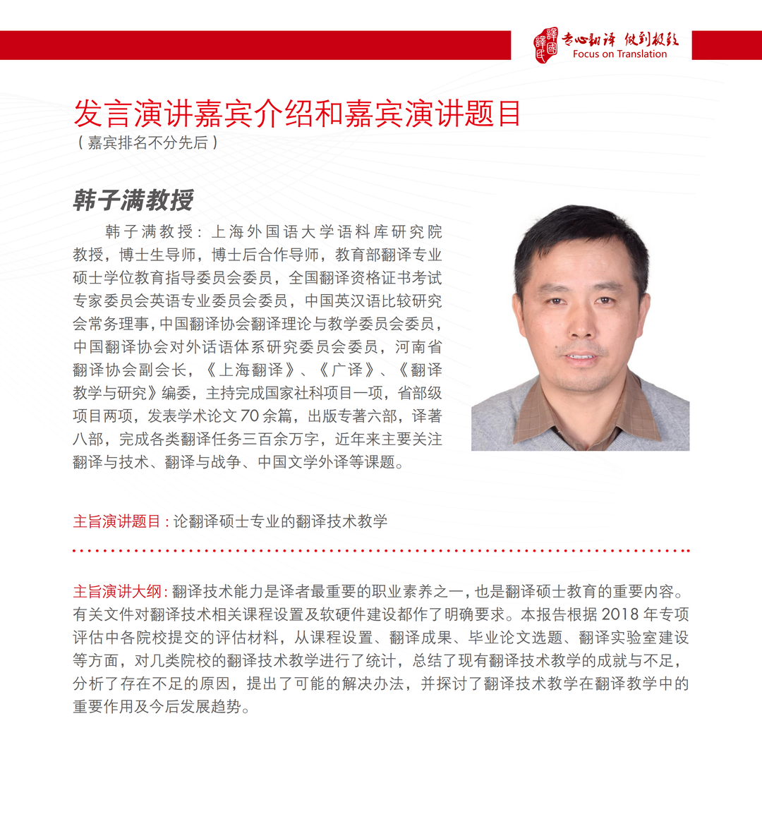 6月6日下午,由上海外国语大学语料库研究院韩子满教授做主旨为《论翻译硕士教育中的翻译技术教学》的精彩发言;华侨大学外国语学院院长毛浩然教授做主旨为《外语教师科研突破的痛与通》的精彩发言;译国译民翻译服务有限公司林世宋董事长做主旨为《校企合作助力翻译学科发展 - 译国译民特色探索》。
