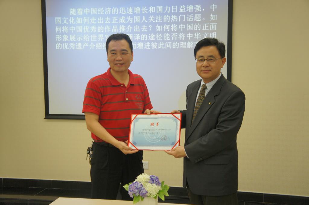 4月22日下午,由人事处、教师发展中心主办,翻译学研究中心承办的翻译教授发展论坛第三讲在广外北校区云山A座一楼教师发展中心多功能会议室举行。此次邀请到了福建工程学院人文学院院长、闽江学者特聘教授张旭作题为“文化走出去之现状与反思:从禅宗的英译说起”的讲座。会议由中心研究员何家宁教授主持。高级翻译学院院长平洪,副院长李明、赵军峰,翻译学研究中心主任莫爱屏和研究员穆雷教授等出席了此次讲座。讲座开始之前,莫爱屏教授代表中心向张旭教授颁发了兼职研究员聘书。