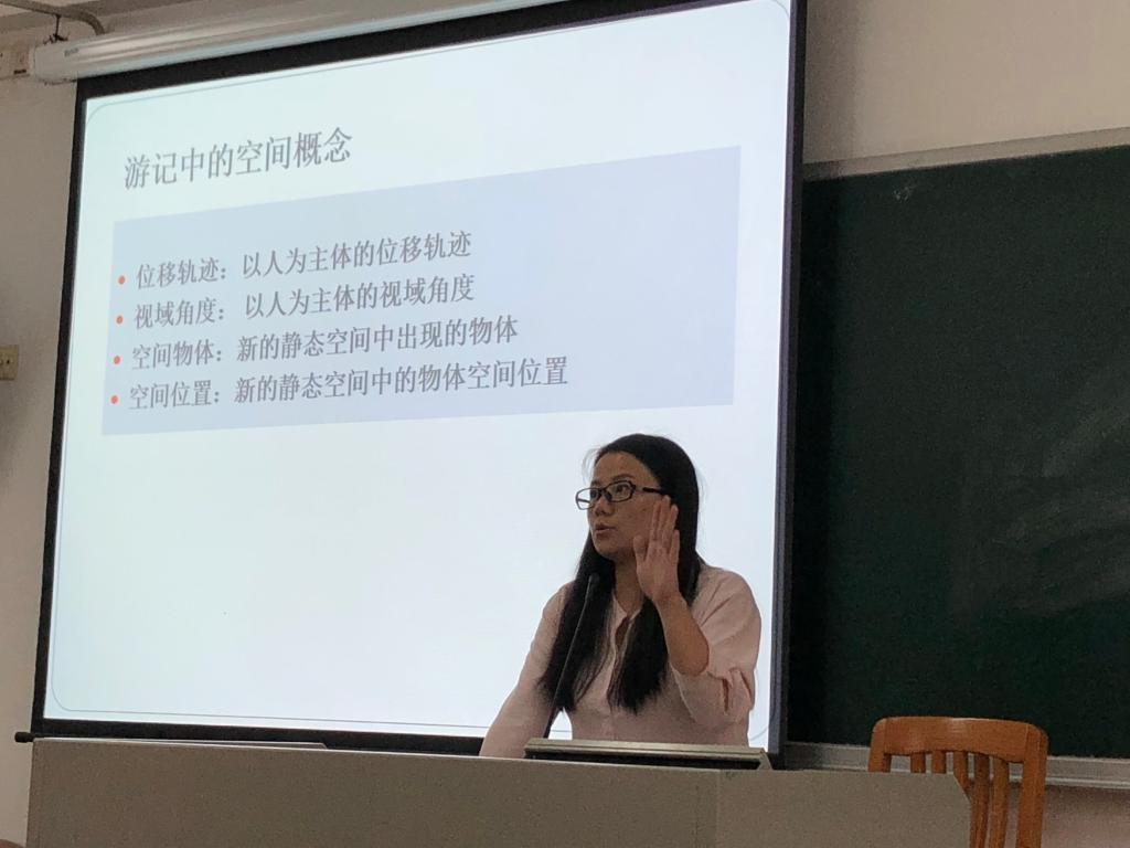 贺婷婷在讲座的一开始通过对“游”一字的分析,引发大家对游记定义的思考,随后她对游记的发端与发展进行了简要的梳理,从内容、对象、地理及出行目的对游记进行了划分。期间贺婷婷也向参与者概述了中西方游记的差异,以及游记自身的功能。在谈及功能时,她提出了游记的地理价值和文学价值,这为其从人文地理学研究游记提供了有力支撑。最后,贺婷婷介绍了文学作品中的空间概念,并结合相关文学作品,就空间概念的翻译提出了自己的理解。