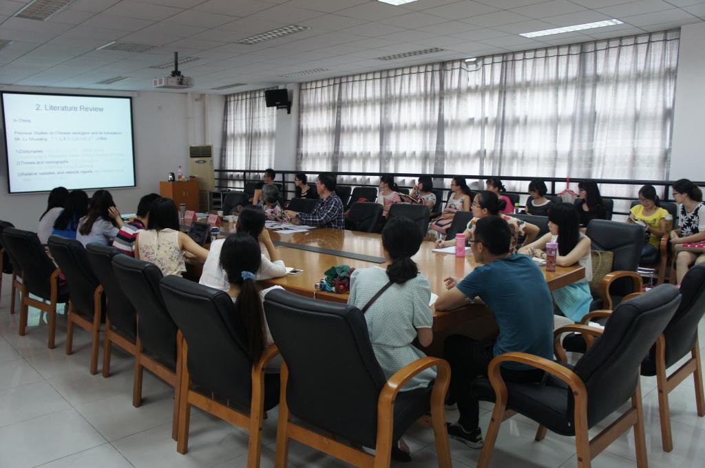 2014年6月11日下午,第三期翻译学硕士论坛暨2012级翻译学硕士研究生开题预答辩活动在六教A421会议室举行。我校英文学院冯之林教授、西语学院博士生导师蔡小红教授和我中心研究员何家宁教授担任点评嘉宾。此次论坛由何家宁教授主持。参与答辩的学生为高级翻译学院2012级翻译学硕士研究生陈劲劲、赵文慧、满德亮和何赛兰。来着英文学院、西语学院和高翻学院的2012级和2013级部分研究生参加了本次论坛活动。