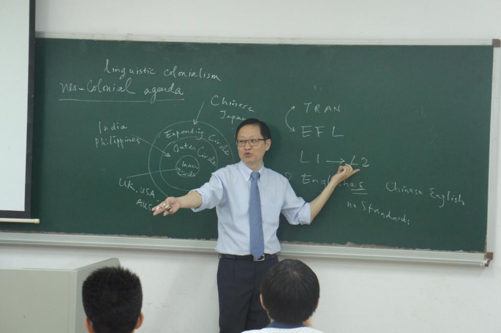 陈德鸿教授首先阐述世界英语(world Englishes)的概念,指出当今世界英语盛行之下的语言帝国主义(languageimperialism)与新型殖民主义(Neo-colonialism)倾向,即随着英语作为强势的通行语(lingua franca),逐渐造成本族语言与文化的丧失,从而沦为英语国家的新型“殖民地”。鉴于此,陈德鸿教授针对英语教学进行反思,指出了如今交际教学法(communicative approach)的主要弊端,思索如何能够在英语教学中保有本族语语言与文化。最后,陈德鸿教授提倡采用综合的外语教学方法,即在英语交流中仍保留本族语思维方式与文化特色。