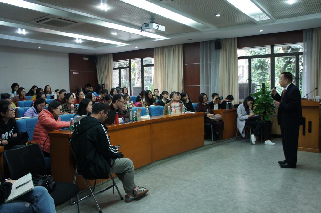 赠书仪式结束后,张教授就“译事三关”展开主题发言。张教授将翻译分为理解关、表达关和文化差异关等三大难关。首先,在理解关,作者指出若译文意义不清,可能是由于译者未能正确理解整个句子,并通过翻译的实例进行说明。其次,关于表达关,张教授指出表达关比过理解关更难,而中译外时尤其困难。译者表达的不是自己的思想,而是别人的思想。译者必须用与原语结构大不相同的译语,忠实传达原文的意义和风格。译文中最合适的词常常不存在于双语词典,而来自译者有再创作能力的头脑。同样,表达关的困难也通过举例进行了说明。最后,在文化差异关,张教授指出,译文中原语的习惯表达法、典故往往为译语所不容。翻译中的文化问题归根结底是语言问题。在举例说明中,张教授突出体现了翻译中的英汉文化距离。在说明译事三关之余,张教授指明突破这三大难关的根本在于具备良好的语言功底,主张译者在平时学习中多积累语言知识,关注跨语言的文化交流。