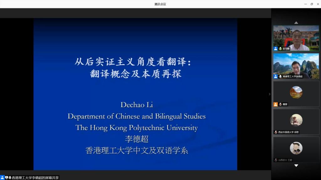 2020年11月12日上午10点,由广外人事处 教师发展中心主办,翻译学研究中心承办的“建校55周年系列学术活动”之教师发展论坛第137讲暨翻译学硕士研究生论坛和岭南译学前沿讲座第219期在线举行。本次讲座邀请了香港理工大学中文及双语学系副教授、香港翻译学会会刊《翻译季刊》主编李德超,讲座主题为“从后实证主义角度看翻译:翻译概念及本质再探”。此次活动由翻译学研究中心主任赵军峰教授主持,讲座通过腾讯会议平台面向校内外师生进行了分享。
