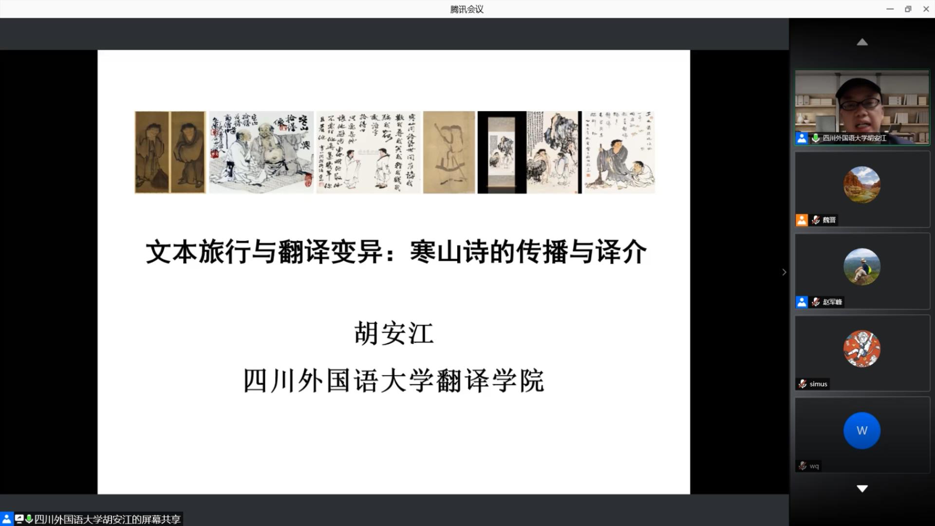 2021年3月23日,四川外国语大学胡安江教授受翻译学研究中心邀请做客广外“著名教授论坛”第500讲,在云端为我校师生带来了一场题为“文本旅行与翻译变异:寒山诗的传播与译介”的学术讲座。本次讲座由我校人事处、教师发展中心主办,翻译学研究中心承办,翻译学研究中心主任赵军峰教授主持,200多名师生参加了本次讲座。