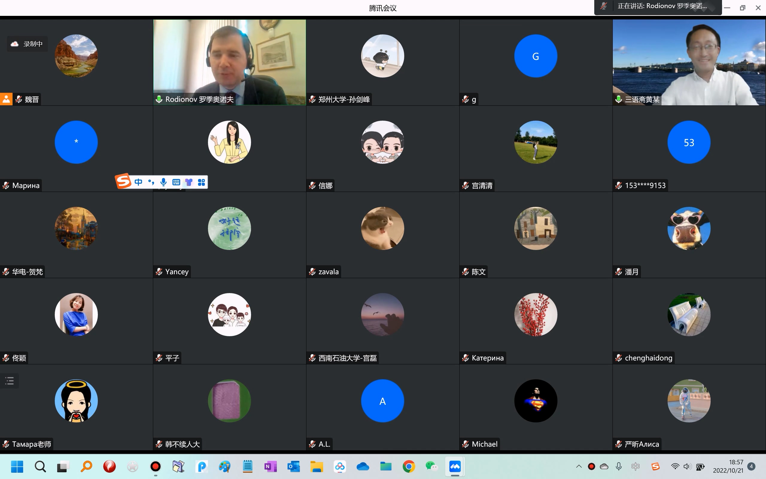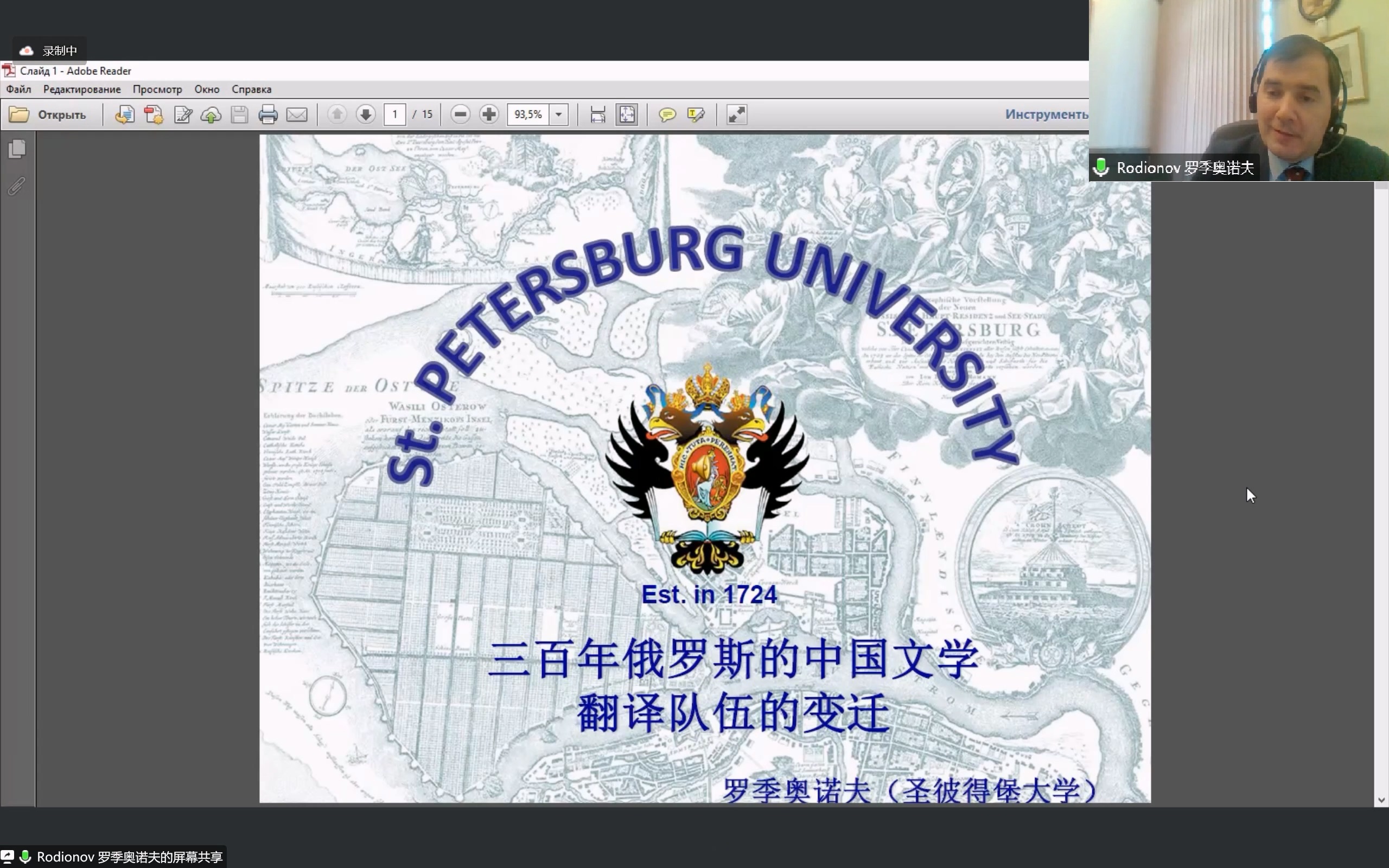 2022年10月21日19:00,广东外语外贸大学海外名师讲学项目系列讲座(一)在云端开讲。应我校翻译学研究中心邀请,知名汉学家、翻译家、俄罗斯圣彼得堡国立大学副教授、东方系常务副主任罗季奥诺夫(Aleksei Rodionov)为我校师生以及国际学子学友作了题为“三百年俄罗斯的中国文学翻译队伍的变迁”的精彩讲座。讲座由广东外语外贸大学研究中心专职研究员黄忠廉教授主持。