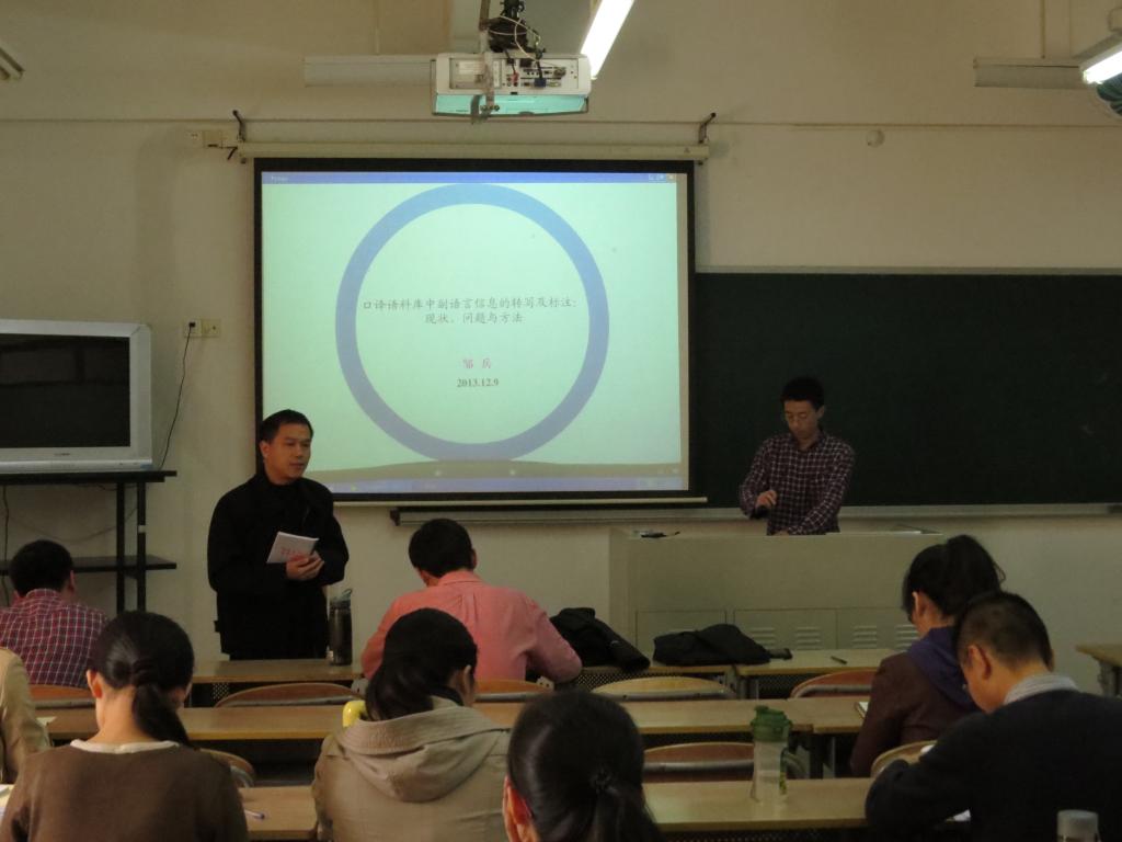 On 9th, December, Translation Ph.D candidate Zou Bin gave a lecture on the dictation and mark of paralinguistic in interpretation. He mainly talked about the current situation, problems and solutions in terms of paralinguistic. Zou, at the beginning of the lecture, pointed out the existing problems in the corpora study of interpretation, especially the lack of the preliminary research on the paralinguistic. Latter, he gave a definition of paralinguistic, based on which he conducted a research on about 10 corpuses worldwide. In the research, he paid special attention on the dictation and mark of paralinguistic. He found out the popular problems, and then gave some suggestions on the dictation and mark of the paralinguistic, including the tool for marking, the procedure of marking and revisions.
